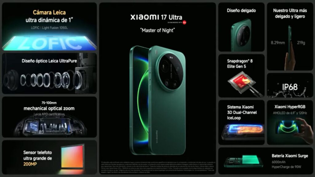 En cuanto a la imagen,el Xiaomi 17 Ultra lidera con el primer sensor de cámara principal LOFIC de 1″ de Xiaomi,el Light Fusion 1050L,que promete mejorar el rendimiento HDR de última generación. Además,incorpora una cámara teleobjetivo Leica de 200MP y 75-100 mm con zoom óptico mecánico y la capacidad de ampliar hasta 400 mm (17.2x).
