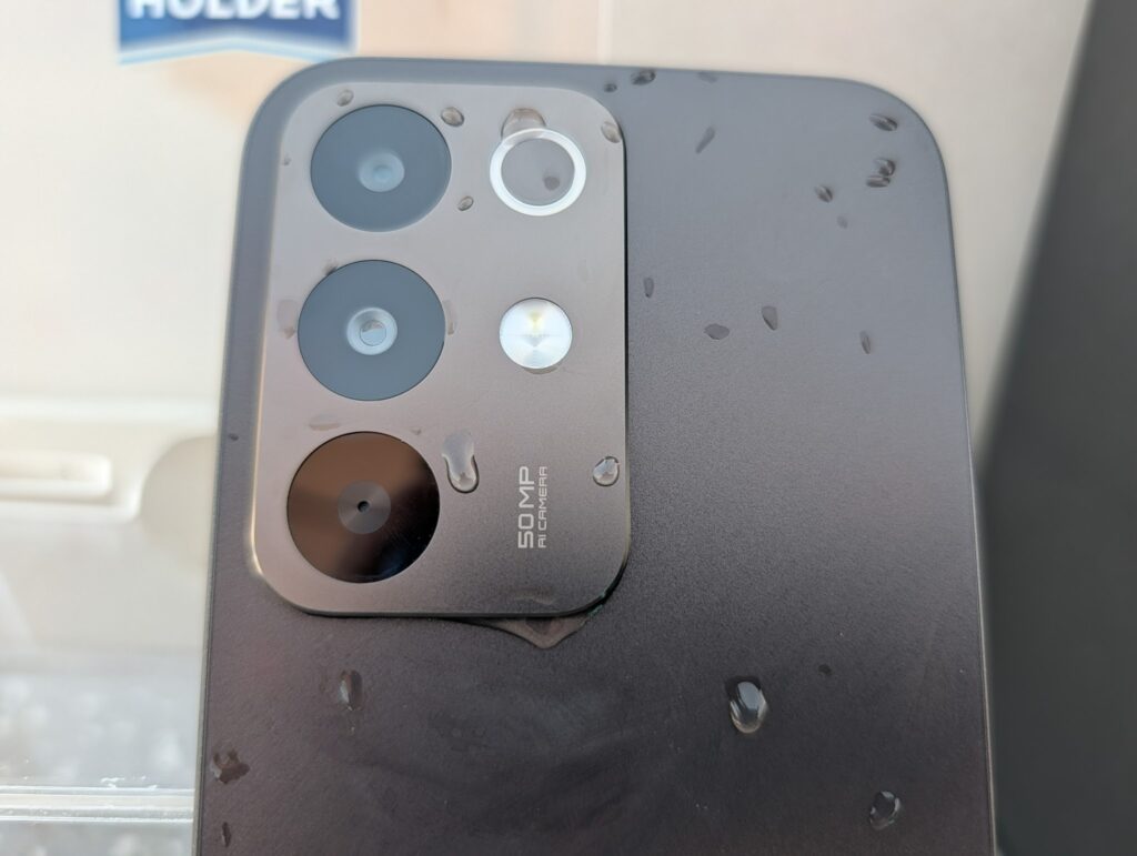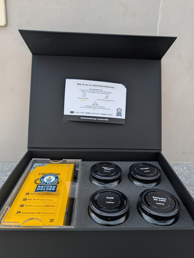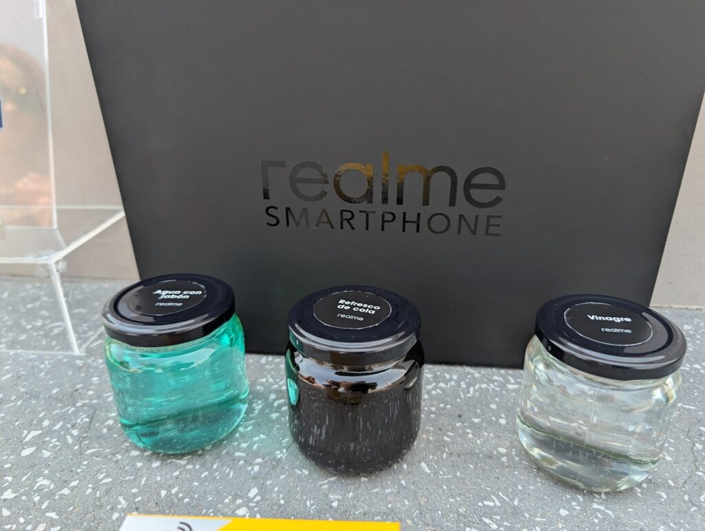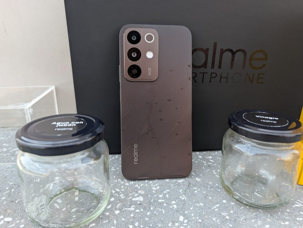 La siguiente prueba fue vaciar sobre el Realme C85 líquidos como vinagre,refresco de cola y café. La verdad es que verter este tipo de líquidos a un teléfono es algo que dudas al principio,pero ya que tomamos confianza,lo hicimos sin piedad.El refresco suele ser letal por el azúcar que pega los componentes,pero tras un enjuague rápido con agua,el C85 siguió funcionando como si nada. Además,el panel táctil no perdió sensibilidad en ningún momento.